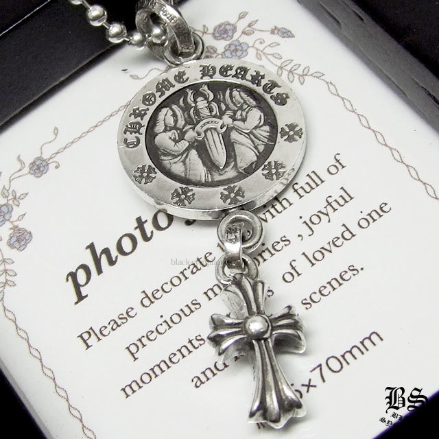 クロムハーツの人気ネックレスチャーム、「エンジェルメダルチャームV2」に「CHクロスベビーファットチャーム」を繋いだ、豪華なネックレスチャームがこちら、「エンジェルメダルV2 ベビークロスチャーム」。エンジェルメダルには「FUCK YOU」の文字が刻まれているものと、CHプラスのモチーフがデザインされているものの2種類のデザインがありますが、こちらはCHプラスのモチーフがデザインされたタイプのアイテムになります。CHプラスのモチーフが描かれていることにより、温かみのあるデザインに感じさせてくれます。シルバーのコイン型のネックレスチャームには、ダガーを支えている二人のエンジェルが描かれています。クロムハーツのネックレスの中でも、神聖なデザインが印象的で、永年愛され続けているチャームの一つ。そんなチャームの下に、クロムハーツの大人気チャームを繋げることにより、ワンランク上のネックレスに。ロールチェーン24インチのような長めのネックレスチェーンや、付属しているボールチェーンネックレスの長さを変えず、そのまま身に着けると、縦のラインが美しく見えますので、おすすめです。